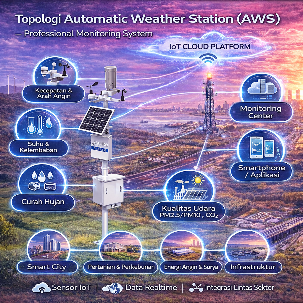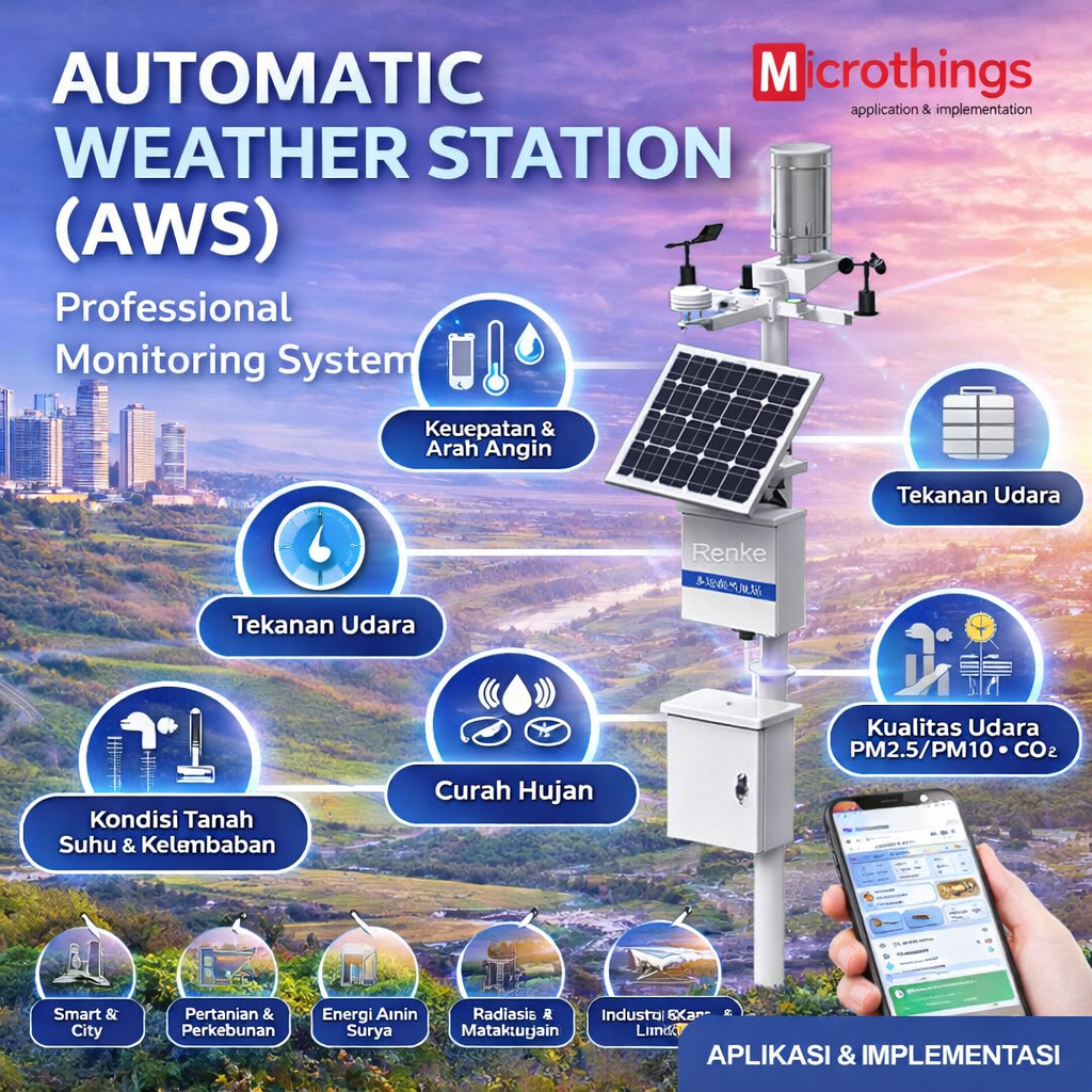 Automatic Weather Station (AWS) adalah sistem pemantauan cuaca profesional yang terdiri dari berbagai sensor meteorologi, unit monitoring (data logger), dan sistem catu daya terintegrasi. Sistem ini dirancang untuk mendukung penelitian cuaca dan iklim secara akurat di berbagai lokasi.