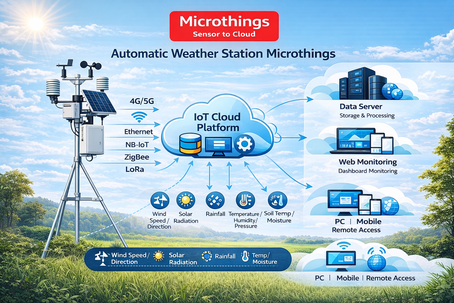Automatic Weather Station Microthings adalah stasiun cuaca otomatis berbasis IoT yang digunakan untuk memantau suhu, kelembaban, tekanan udara, curah hujan, kecepatan angin, arah angin, radiasi matahari, suhu tanah, dan kelembaban tanah secara real-time melalui platform cloud.