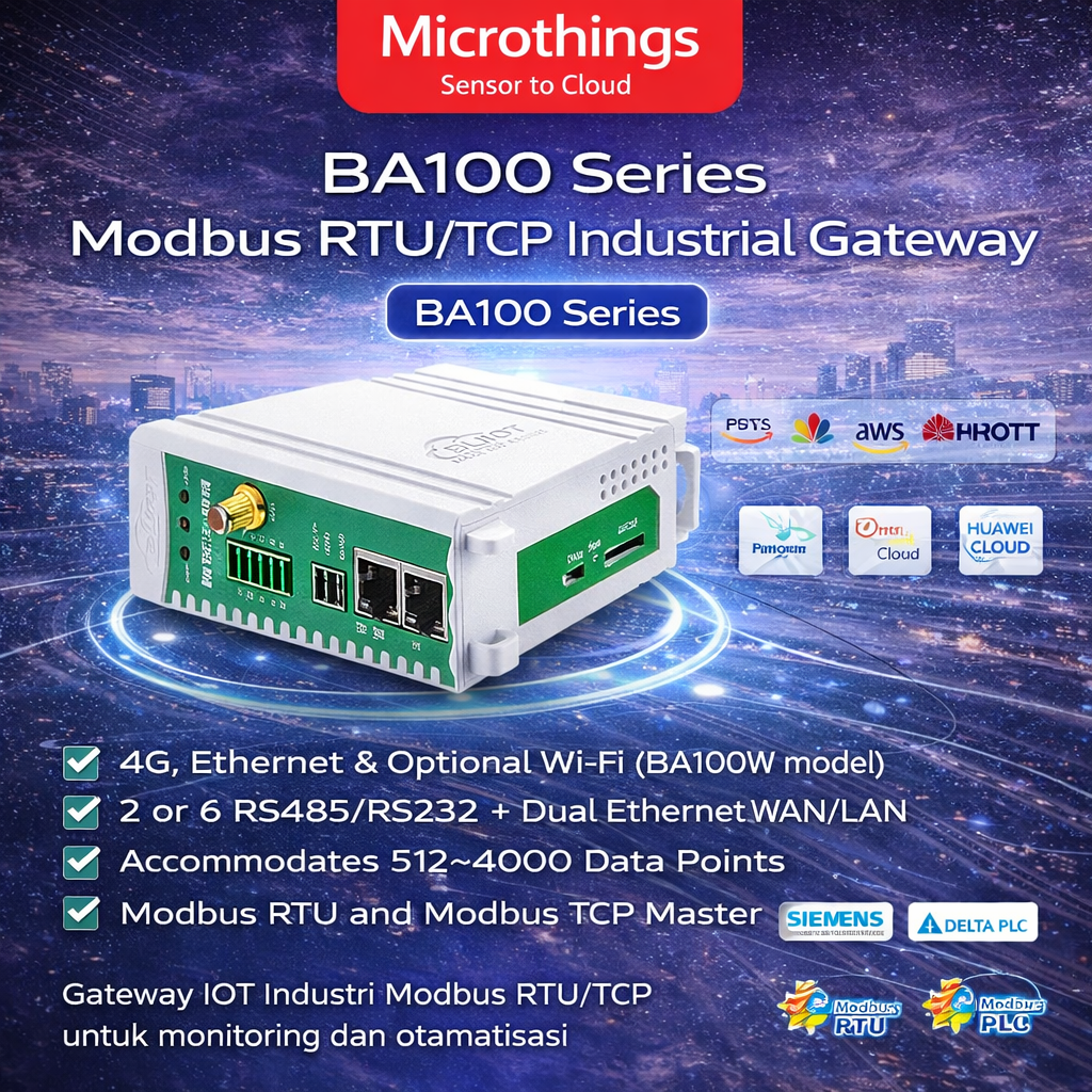 Gateway ini mendukung komunikasi downlink Modbus RTU/TCP Master untuk terhubung ke PLC, sensor, meter, dan perangkat Modbus lain, lalu meneruskan data ke sistem BACnet MS/TP atau BACnet/IP pada sisi uplink agar dapat terintegrasi dengan BMS (Building Management System). Selain itu, BA100 Series juga mendukung transparent transmission untuk konversi dua arah antara Modbus RTU dan Modbus TCP.