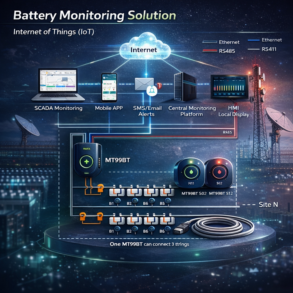 Katalog MT99BT menempatkan solusi ini pada DC Power System (Telecom) dan sistem monitoring baterai untuk site telekomunikasi.