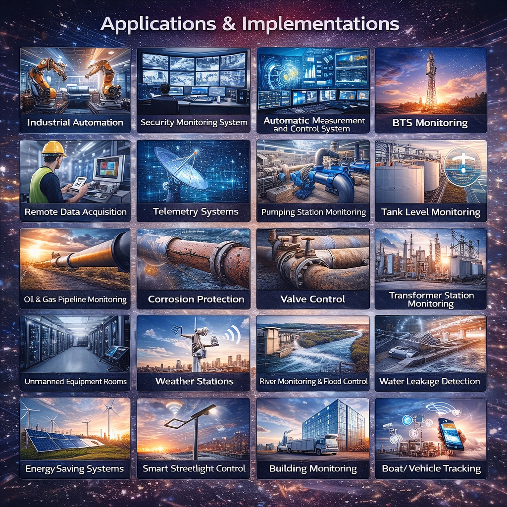- Mendukung alarm otomatis via SMS saat terjadi threshold, recovery, atau gangguan komunikasi