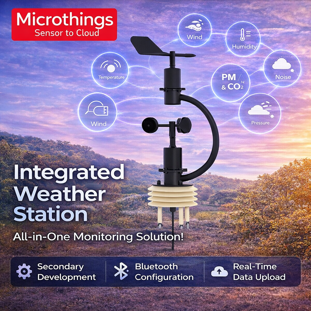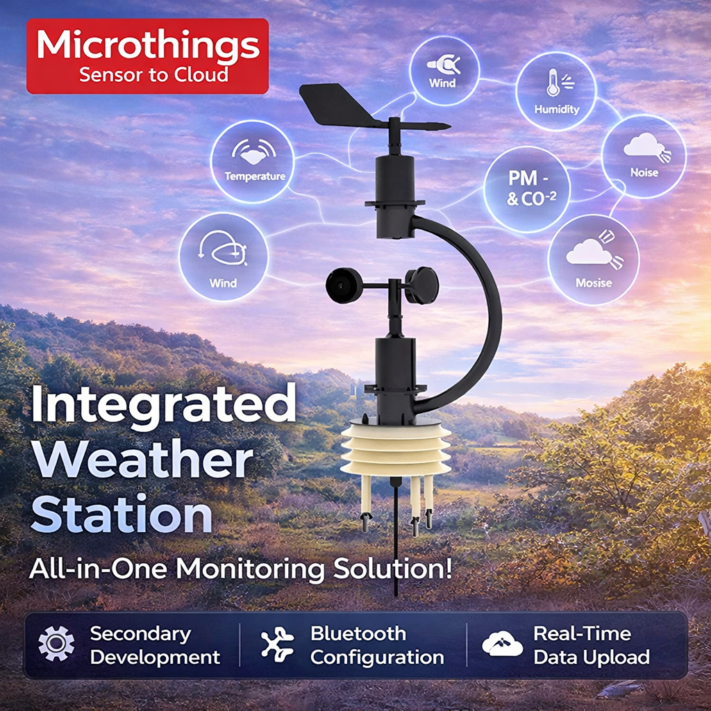 Integrated Weather Station adalah stasiun cuaca portabel dengan desain terintegrasi yang menggabungkan fungsi beberapa sensor dalam satu perangkat. Sistem ini mampu mengukur berbagai parameter lingkungan secara simultan, seperti suhu, kelembaban, PM2.5 & PM10 atau CO2, kebisingan, tekanan atmosfer, kecepatan angin, dan arah angin.