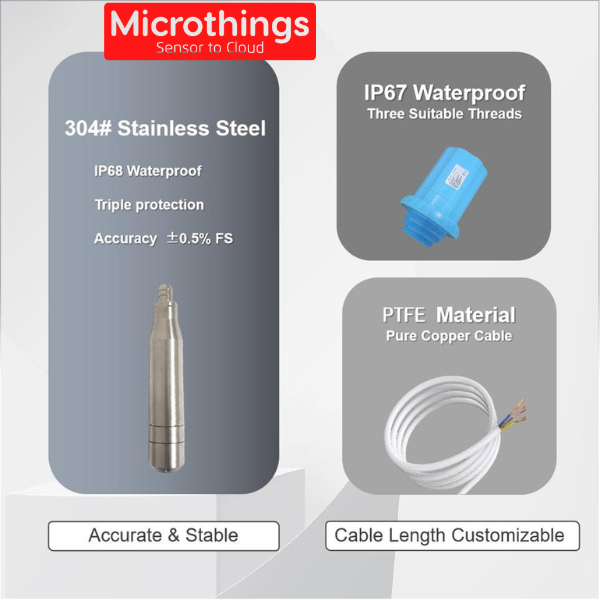 Pressure Liquid Level Sensor DF556 adalah sensor level cairan berbasis tekanan, dengan modul transmisi nirkabel dan baterai. Dengan transduser tekanan terendam, DF556 dapat mencapai akurasi 0,5% dari ketinggian cairan. Rentang pengukuran standar hingga 2,5m. Untuk panjang kabel lainnya, silahkan hubungi sales kami. Itu terintegrasi dengan modul nirkabel seperti NB-IoT, LoRaWAN, Sigfox, CAT-M, GPRS, 4G-LTE dan lain-lain. Data diunggah ke server cloud dalam protokol TCP, MQTT, LoRaWAN atau protokol khusus lainnya. Berlaku luas untuk tangki cair, limbah, air industri, kolam renang, sungai dan lain-lain.