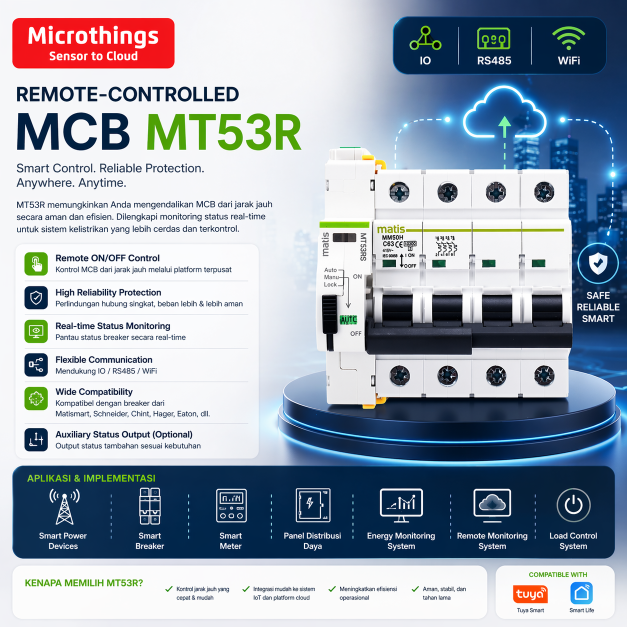 • Dapat dipasangkan dengan breaker merek Matismart, Schneider, Chint, Hager, Eaton, dan merek sejenis