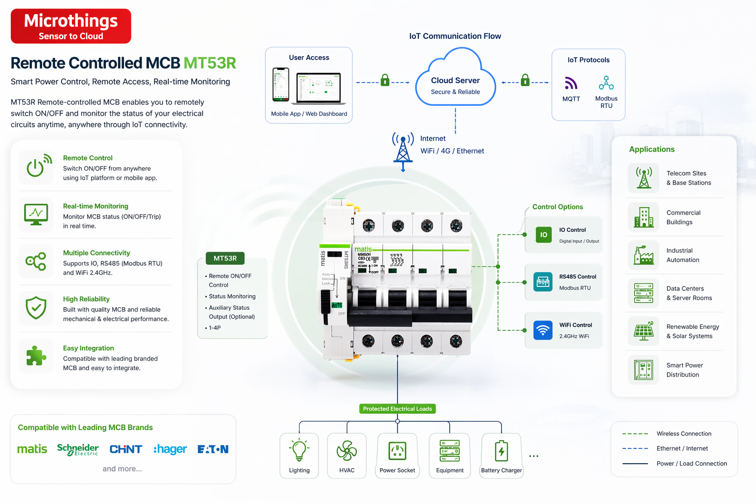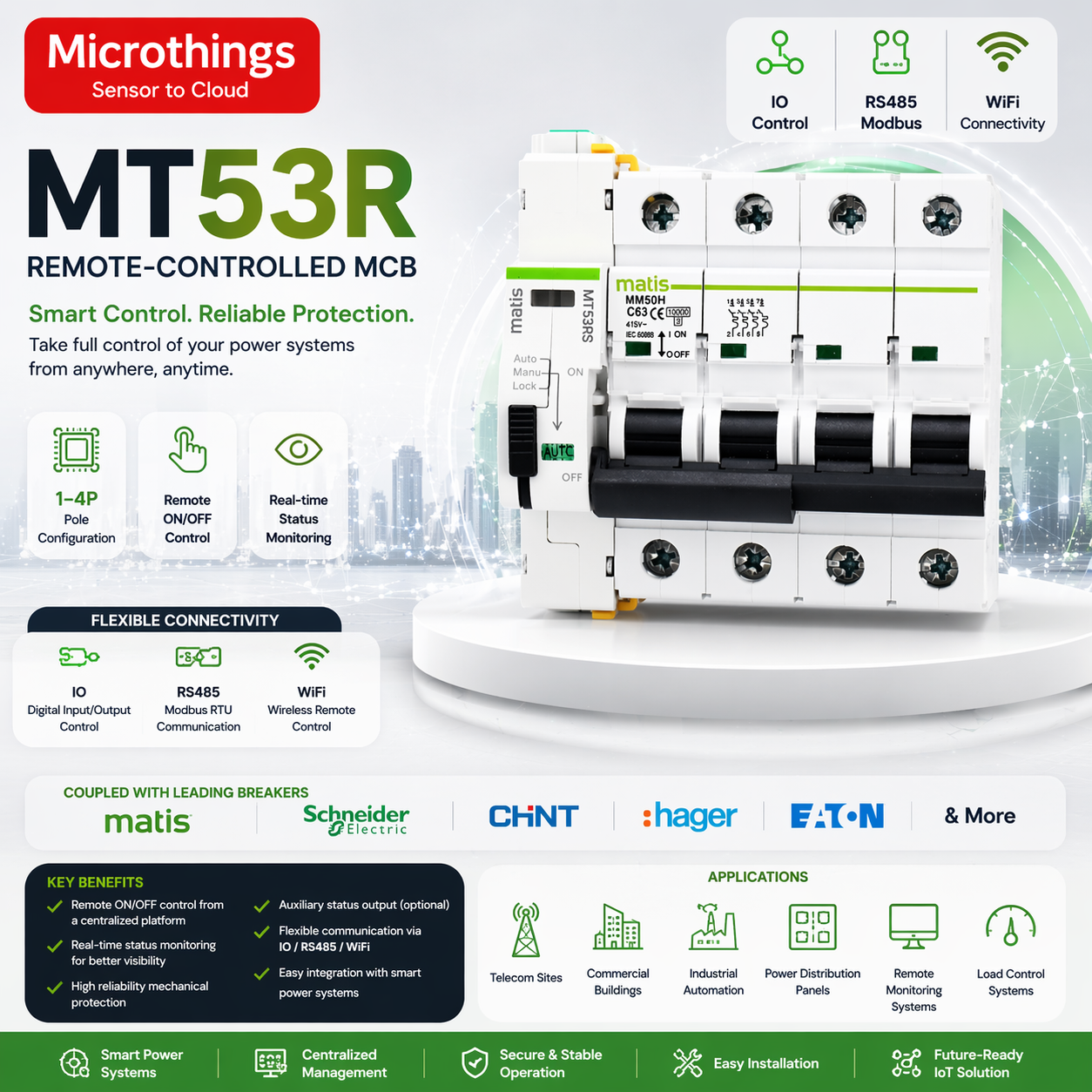 Dengan kombinasi proteksi mekanis berkeandalan tinggi dan status monitoring real-time, MT53R cocok untuk aplikasi pada telecom site, gedung komersial, dan jaringan otomasi industri. Seri ini tersedia dalam varian MT53RS, MT53RI, dan MT53RW, serta mendukung kontrol melalui IO, RS485, dan WiFi.