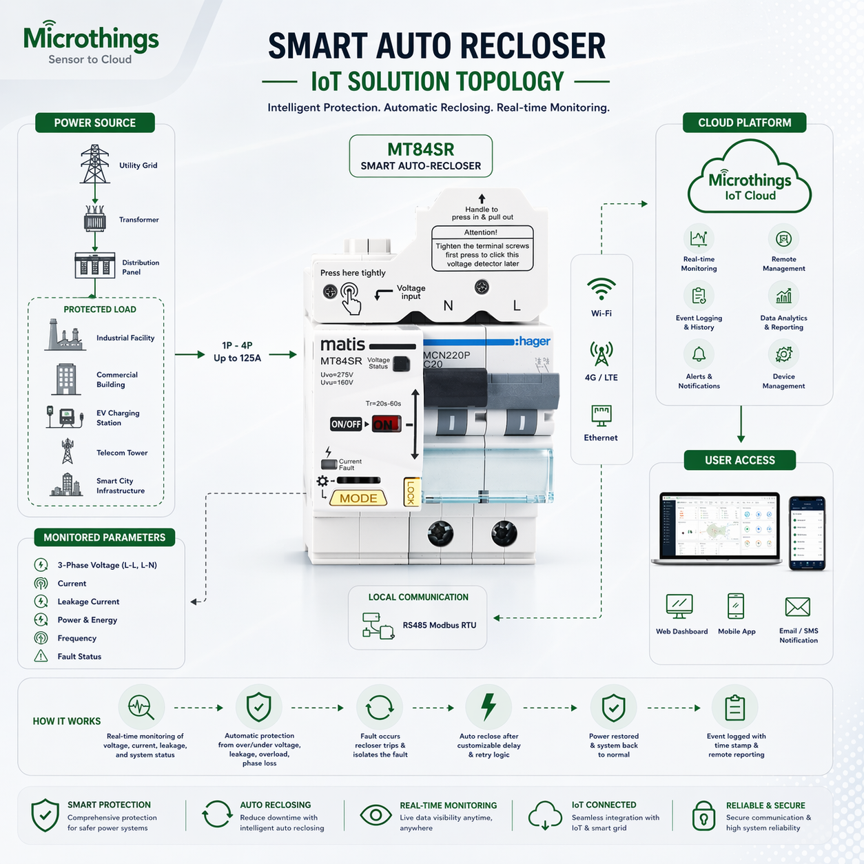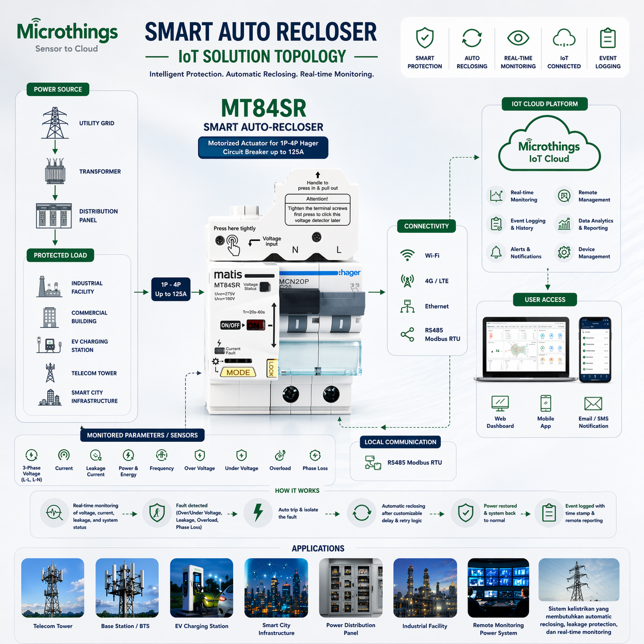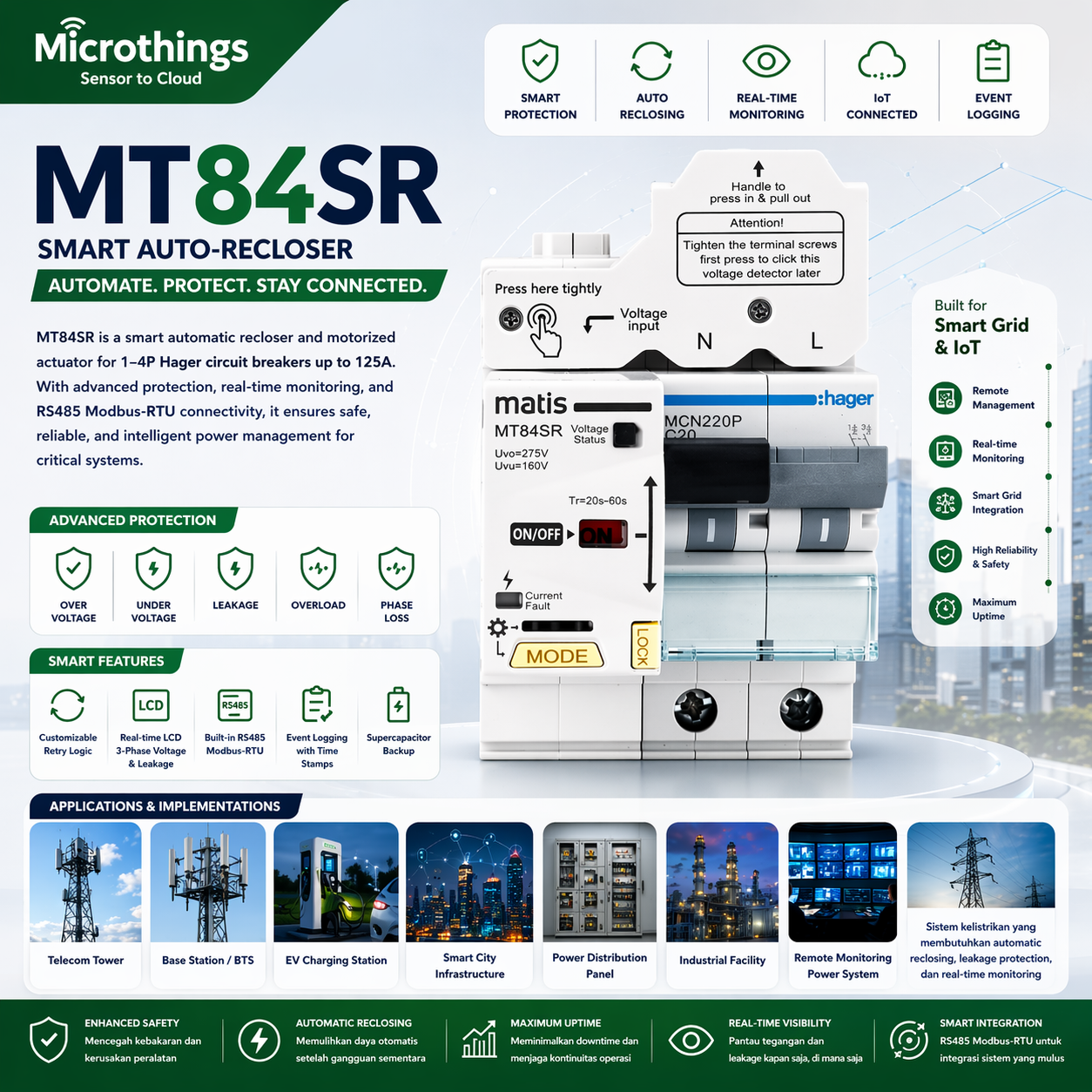 Smart Auto Recloser MT84SR adalah perangkat smart automatic recloser berperforma tinggi yang dirancang untuk mengotomatisasi sekaligus melindungi sistem distribusi daya. Produk ini berfungsi sebagai motorized actuator yang dipasang pada Hager circuit breaker 1P–4P, sehingga memungkinkan pengelolaan breaker secara lebih cerdas melalui komunikasi RS485 Modbus-RTU.