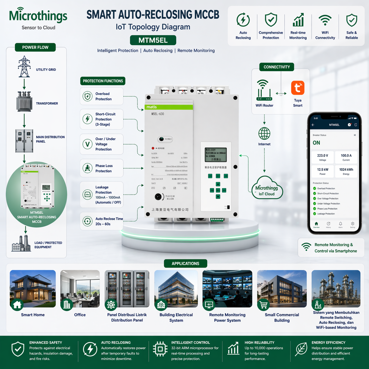 Smart Auto Reclosing MCCB MTM5EL adalah MCCB pintar berperforma tinggi yang dirancang untuk jaringan distribusi daya AC 50Hz dengan fungsi auto-recloser. Produk ini dikembangkan sebagai solusi keselamatan modern untuk melindungi sistem kelistrikan dari gangguan listrik sekaligus memulihkan daya secara otomatis setelah gangguan sementara.