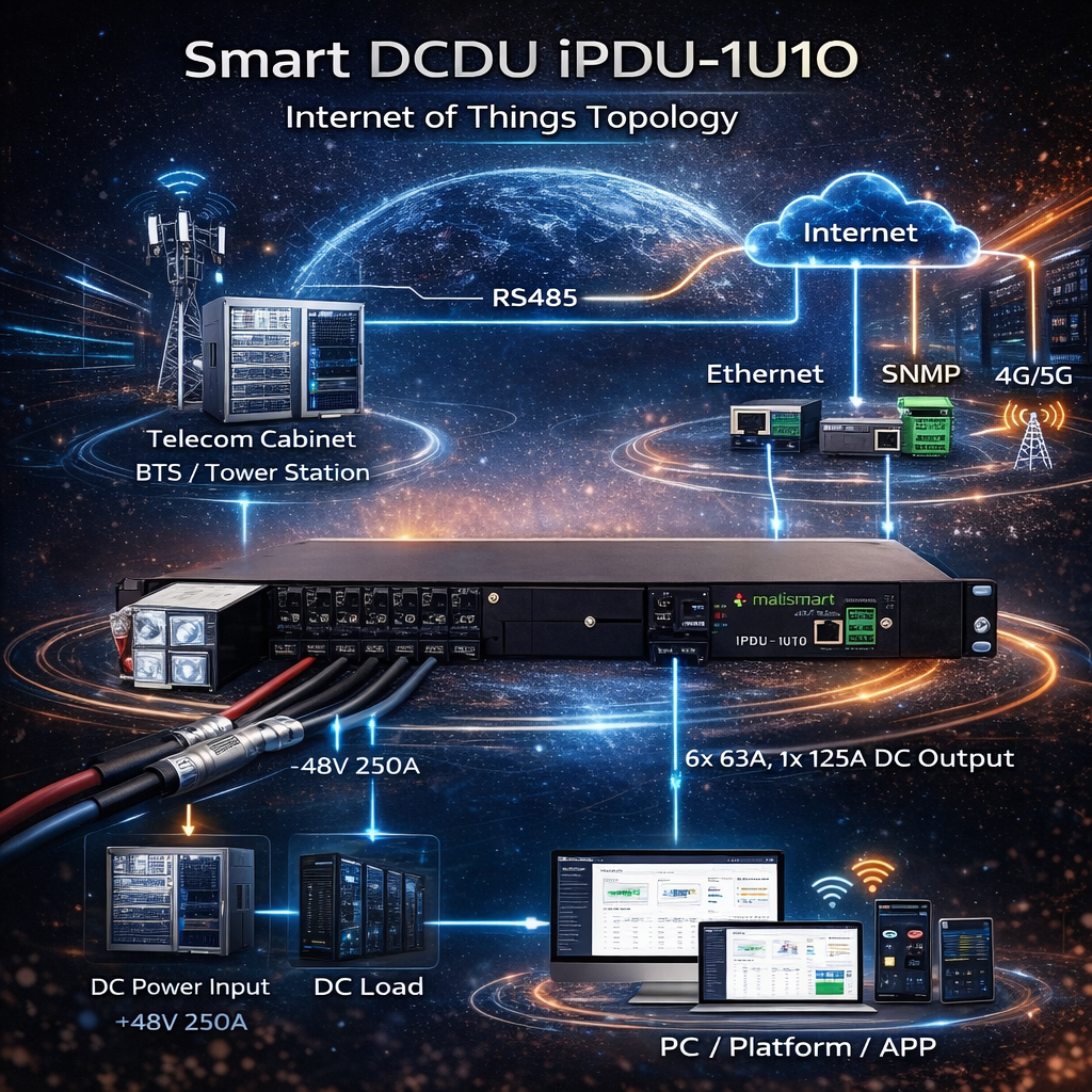 Smart DCDU iPDU-1U10 adalah smart DC power distribution unit berukuran ringkas yang dirancang untuk mendukung distribusi daya DC, monitoring energi, dan kontrol beban pada site telekomunikasi, cabinet densitas tinggi, dan edge infrastructure. Perangkat ini membantu operator memantau konsumsi daya secara real-time sekaligus melakukan pengelolaan sirkuit secara lebih terukur dan efisien.