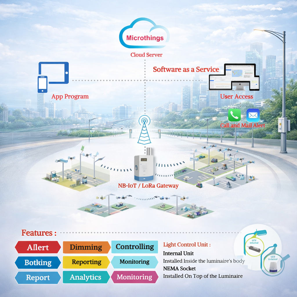 Smart Pole Management System adalah solusi cerdas untuk mengontrol, memantau, dan mengelakkan perangkat pada tiang pintar (smart pole) dan sistem lampu jalan secara terpusat melalui Microthings Cloud Server. Sistem ini menggunakan teknologi LoRa/NBIoT/4G yang hemat energi dan efisien untuk mendukung pengelolaan pencahayaan area publik, jalan, kawasan industri, perumahan, kampus, hingga area komersial berskala besar.