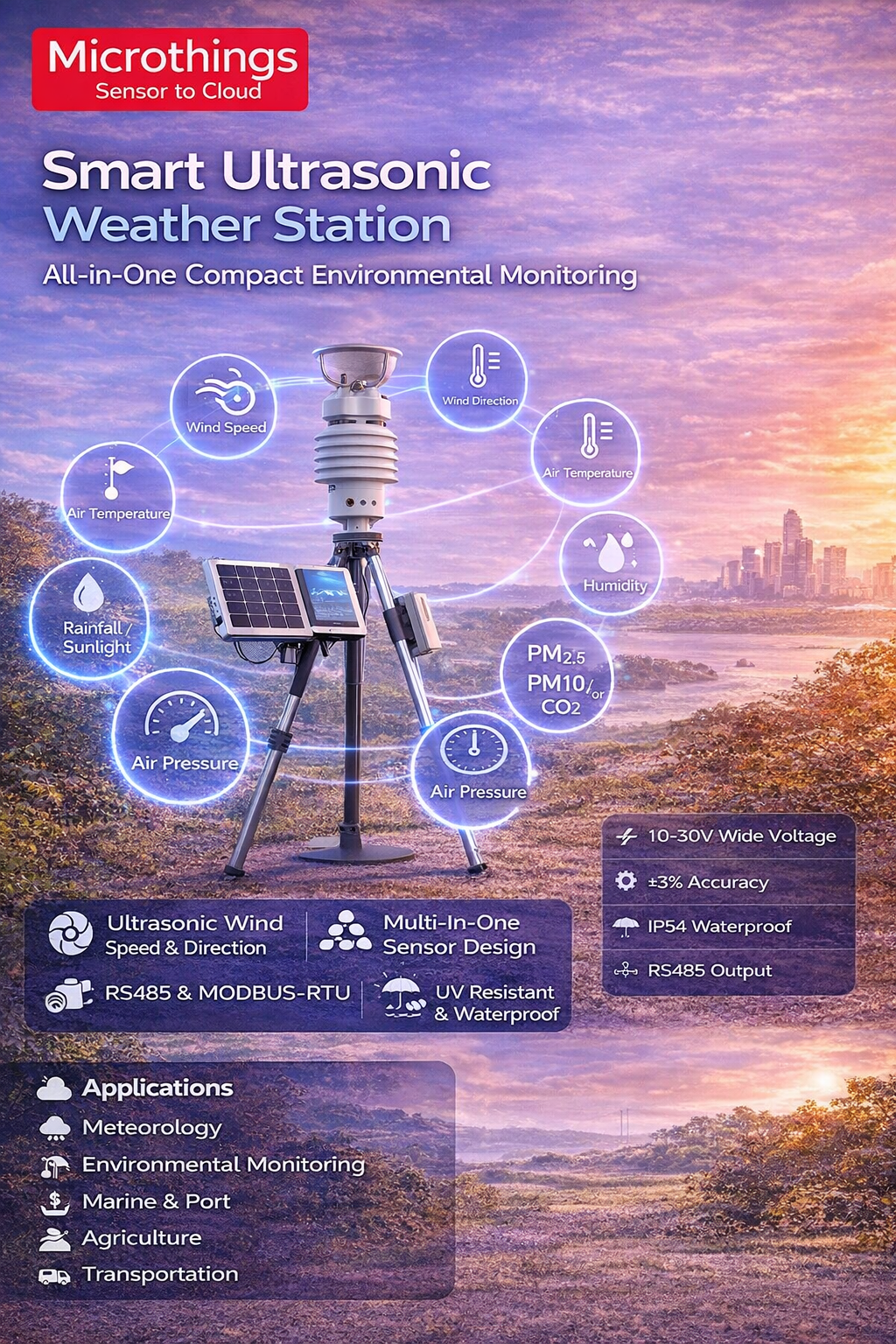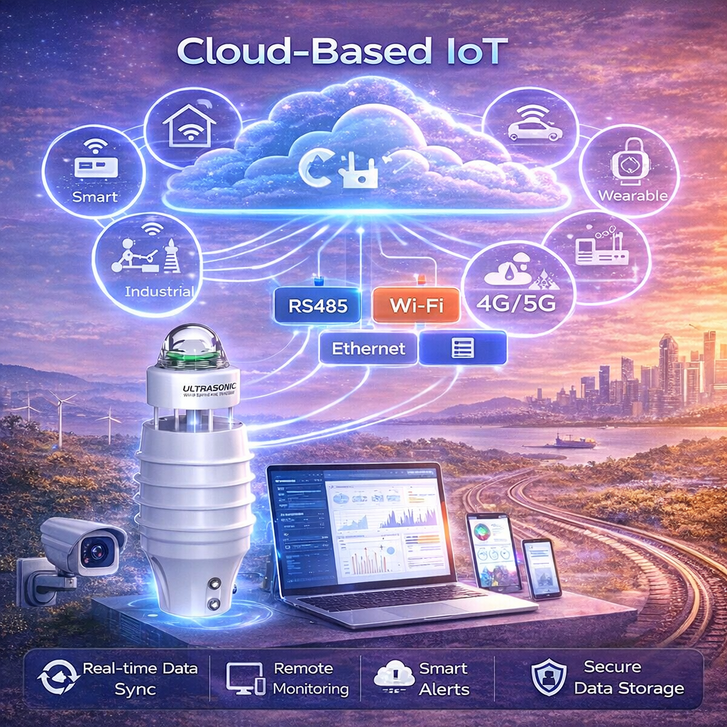 Perangkat ini menggunakan prinsip ultrasonik dan opsi kompas elektronik internal untuk menghitung true wind speed dan true wind direction secara akurat. Housing yang ringkas, tahan UV, kedap air, dan tahan korosi menjadikannya cocok untuk penggunaan luar ruangan dalam berbagai kondisi lingkungan.