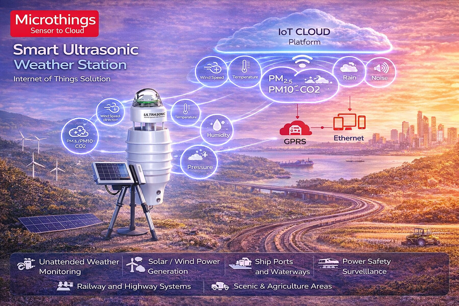 Smart Ultrasonic Weather Station adalah stasiun cuaca pintar berbasis sensor ultrasonik yang mampu mengukur berbagai parameter lingkungan secara real-time dalam satu perangkat terintegrasi. Sistem ini dapat menghitung kecepatan angin, arah angin, tekanan udara, suhu udara, kelembaban relatif, curah hujan atau intensitas cahaya matahari, serta konsentrasi PM2.5 & PM10 atau CO2.