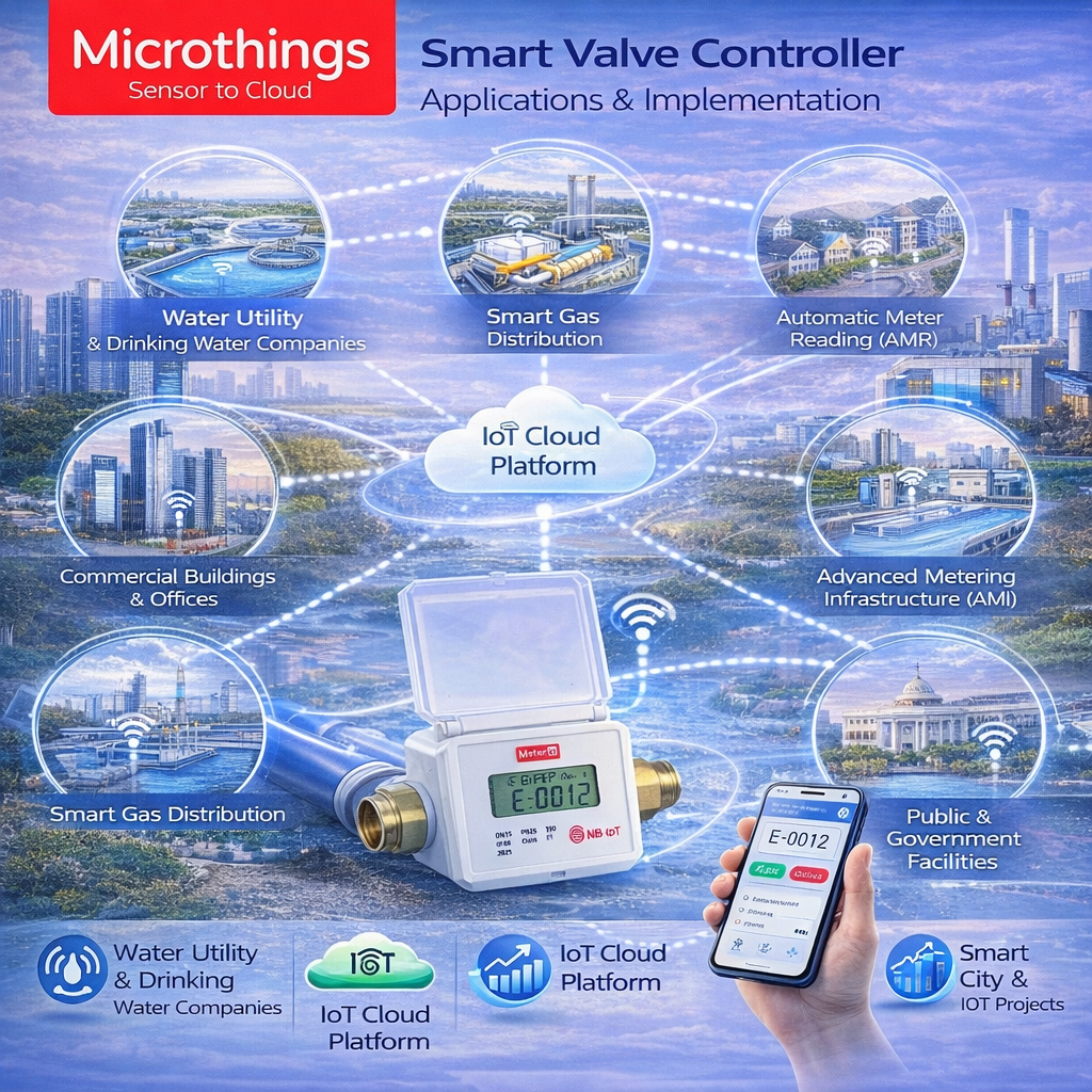 Smart Valve Controller dapat digunakan pada dua skenario utama, yaitu katup independen dan katup penghubung. Perangkat ini umumnya dipasang pada pipa air atau gas untuk mengendalikan aliran cairan maupun gas di dalam pipa. Saat menerima perintah kontrol dari server, perangkat akan menjalankan aksi buka atau tutup katup secara otomatis.