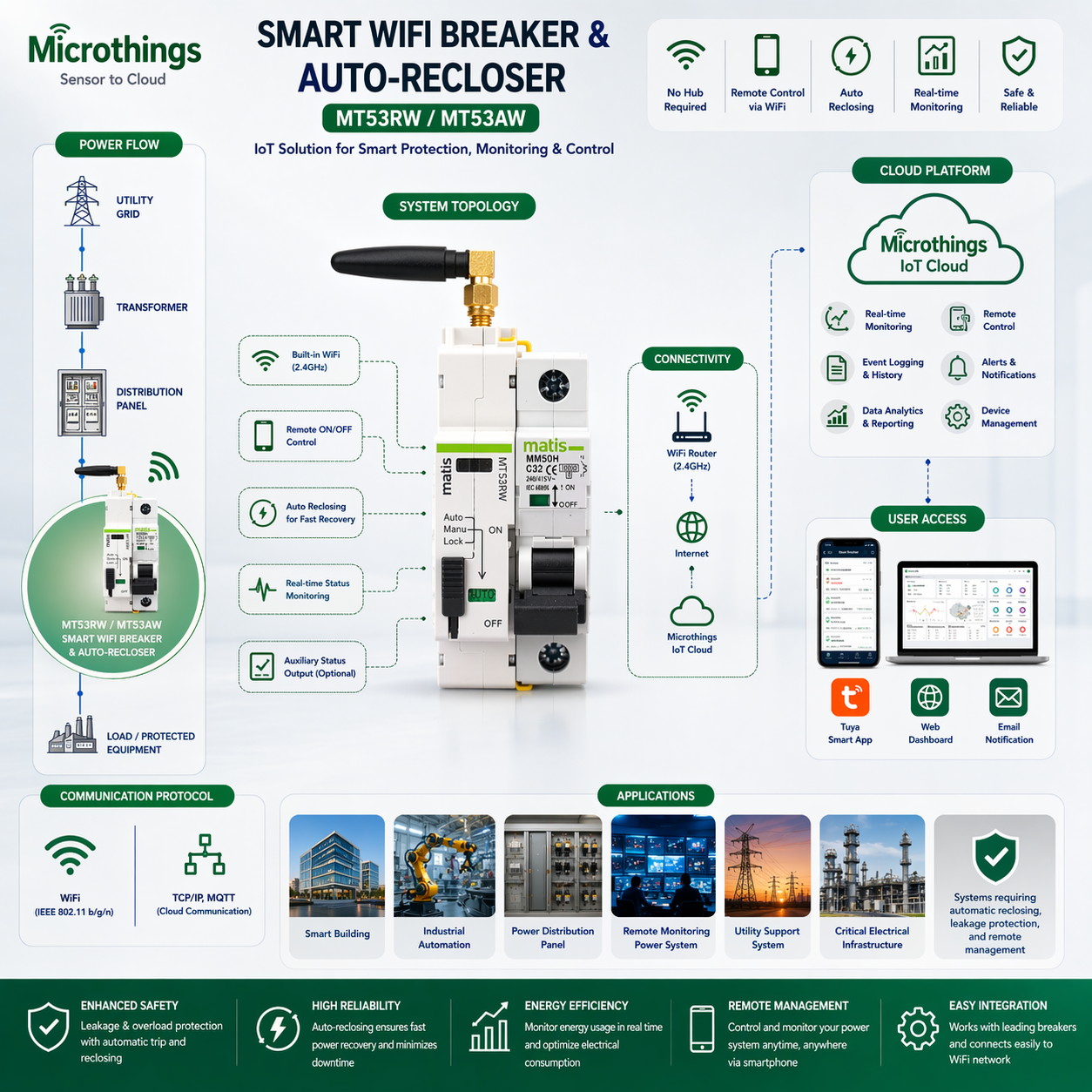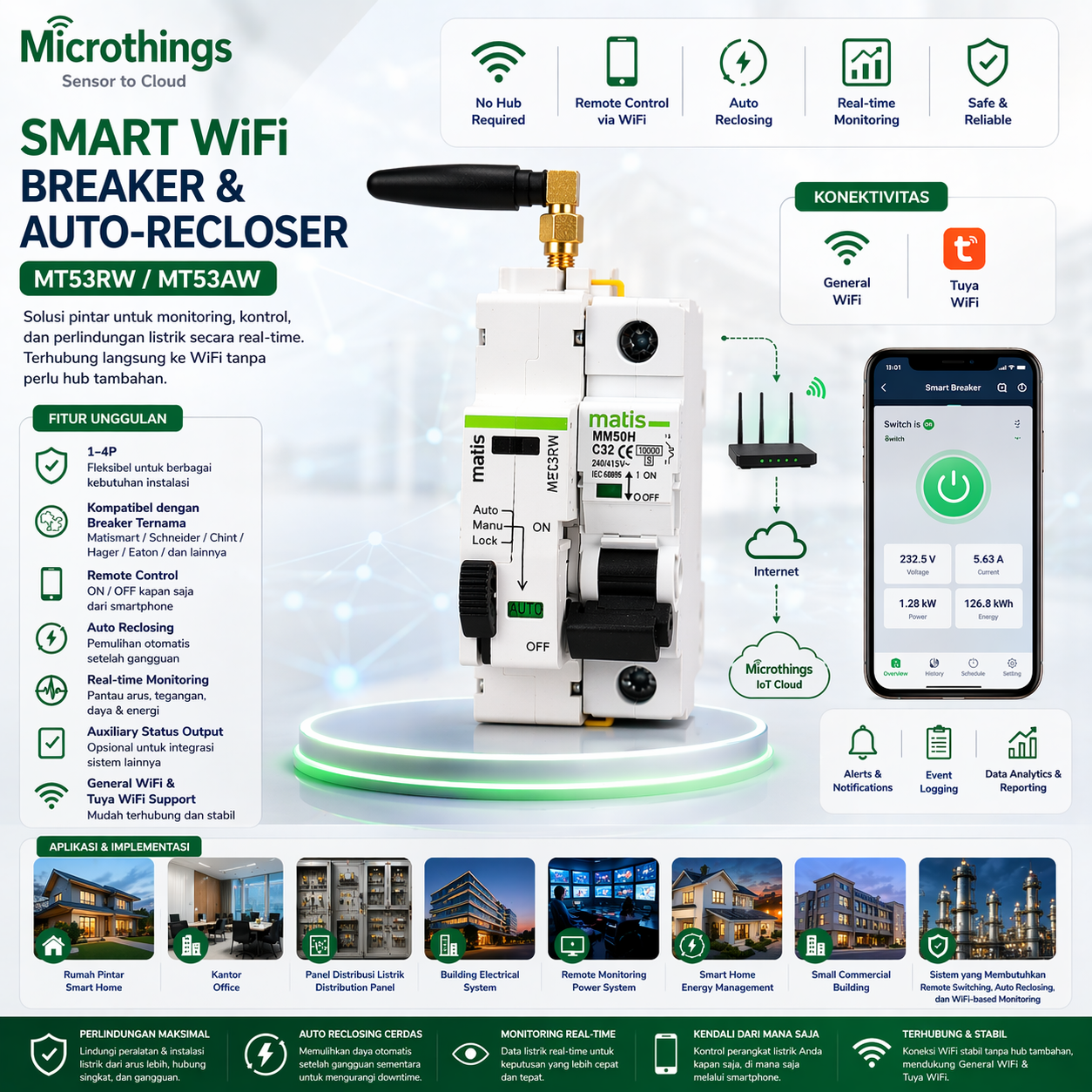 Smart WiFi Breaker and Auto recloser MT53RW / MT53AW adalah smart WiFi breaker dan auto-recloser untuk 1P–4P yang mendukung remote control melalui General WiFi dan Tuya WiFi, kompatibel dengan berbagai merek breaker, serta cocok untuk kebutuhan monitoring dan kendali daya secara real-time.