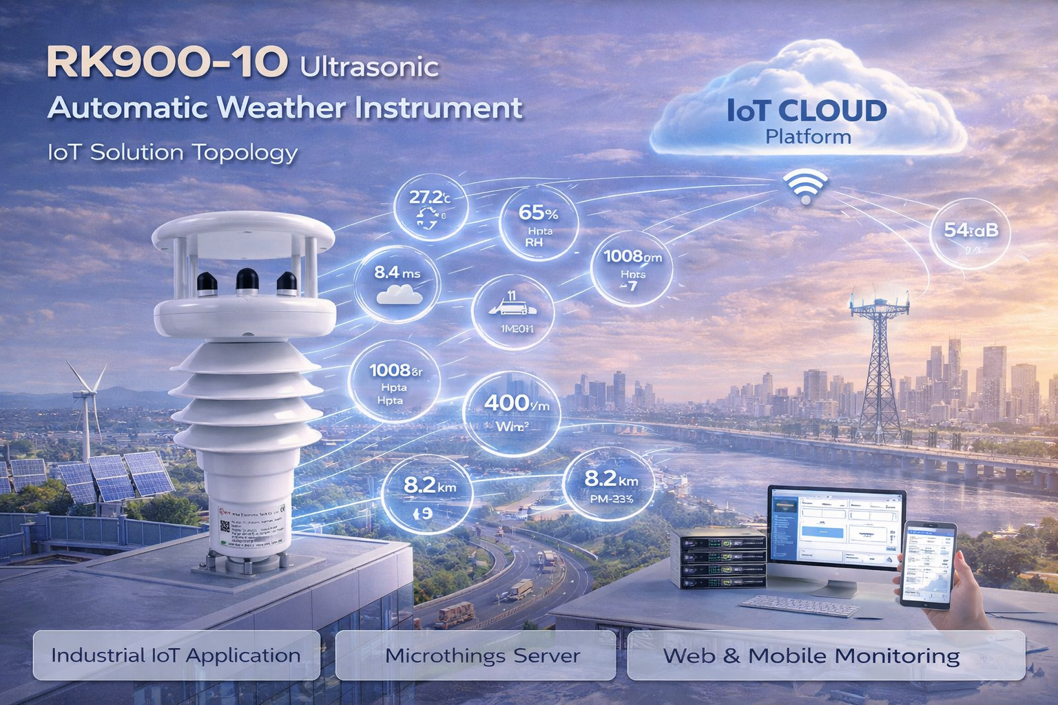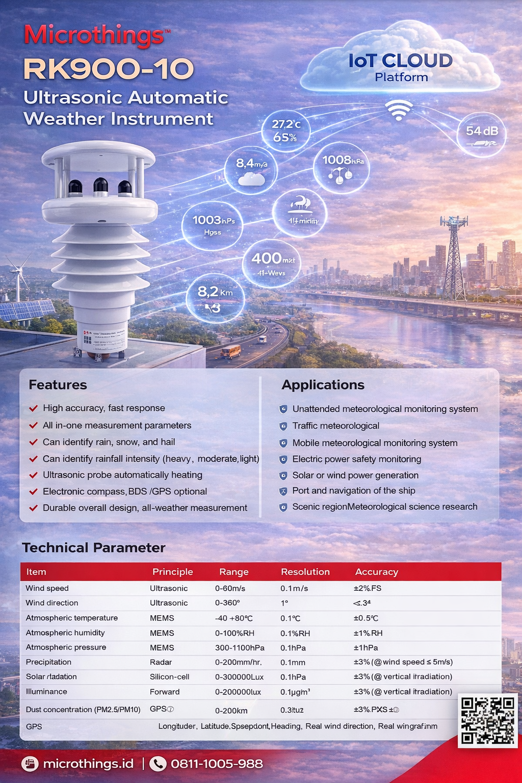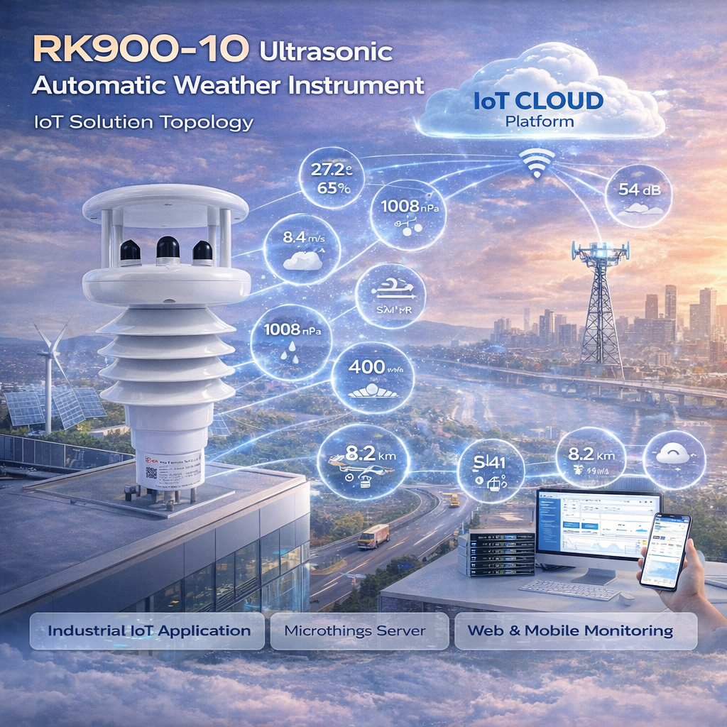 Ultrasonic Automatic Weather Instrument RK900-10 adalah stasiun cuaca otomatis berbasis sensor ultrasonik yang mampu mengukur berbagai parameter meteorologi secara real-time dalam satu perangkat terintegrasi. Perangkat ini dirancang untuk memberikan data lingkungan yang akurat, stabil, dan respons cepat tanpa menggunakan bagian mekanis bergerak (maintenance-free). Dengan teknologi radar untuk deteksi hujan dan sensor ultrasonik untuk angin, RK900-10 sangat cocok untuk berbagai aplikasi industri, smart city, dan monitoring lingkungan berbasis IoT.