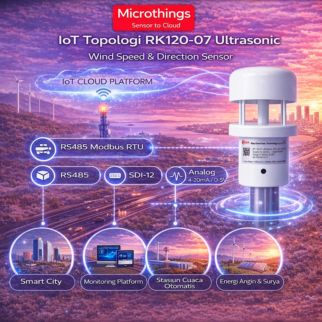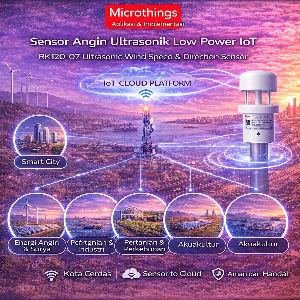 Sensor angin ultrasonik RK120-07 dengan konsumsi daya rendah, tanpa maintenance, dan akurasi tinggi untuk monitoring kecepatan dan arah angin berbasis IoT